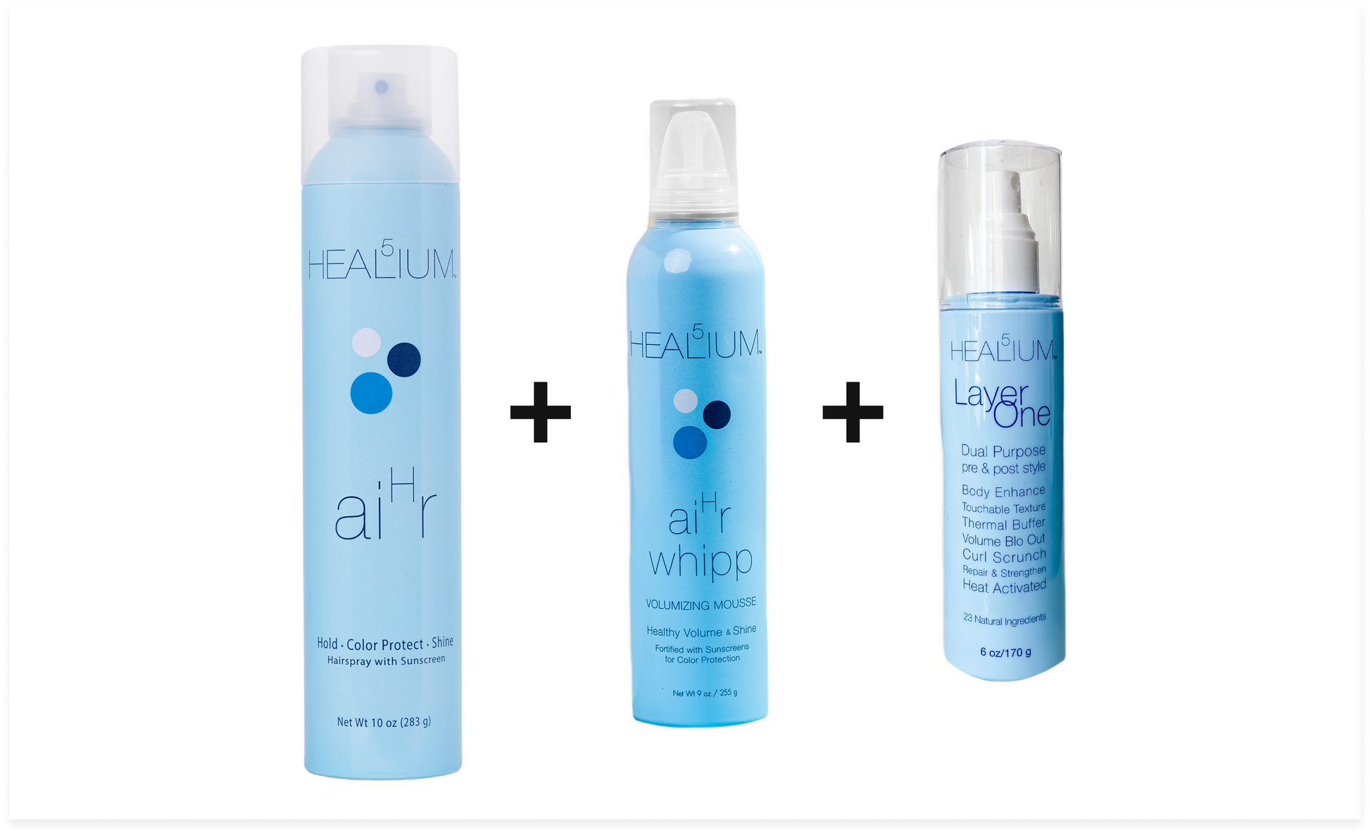 Boost your hair's body and lift with our Essentials Volume Bundle. This trio includes our Layer One Bodifier, a heat-activated formula designed to thicken your hair, our aiHr Whipp Mousse for added body and bounce, and our aiHr Hairspray for textured hold and flexibility. Each product is designed to work together to create a voluminous look that is full of life. Ideal for anyone seeking that extra lift and dimension in their hair.