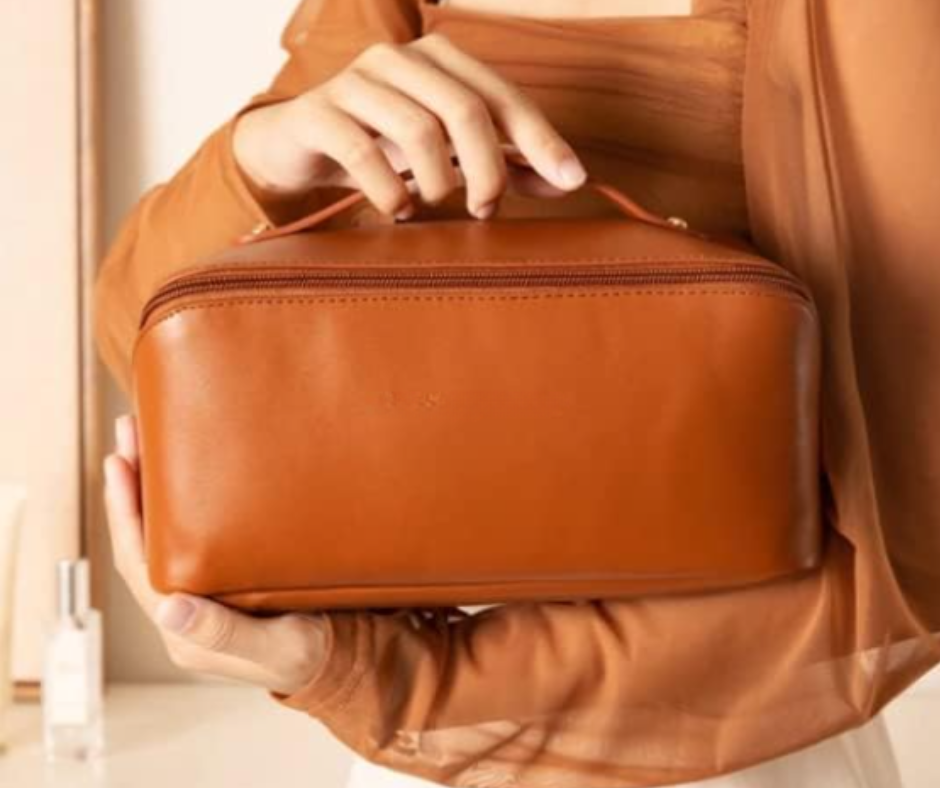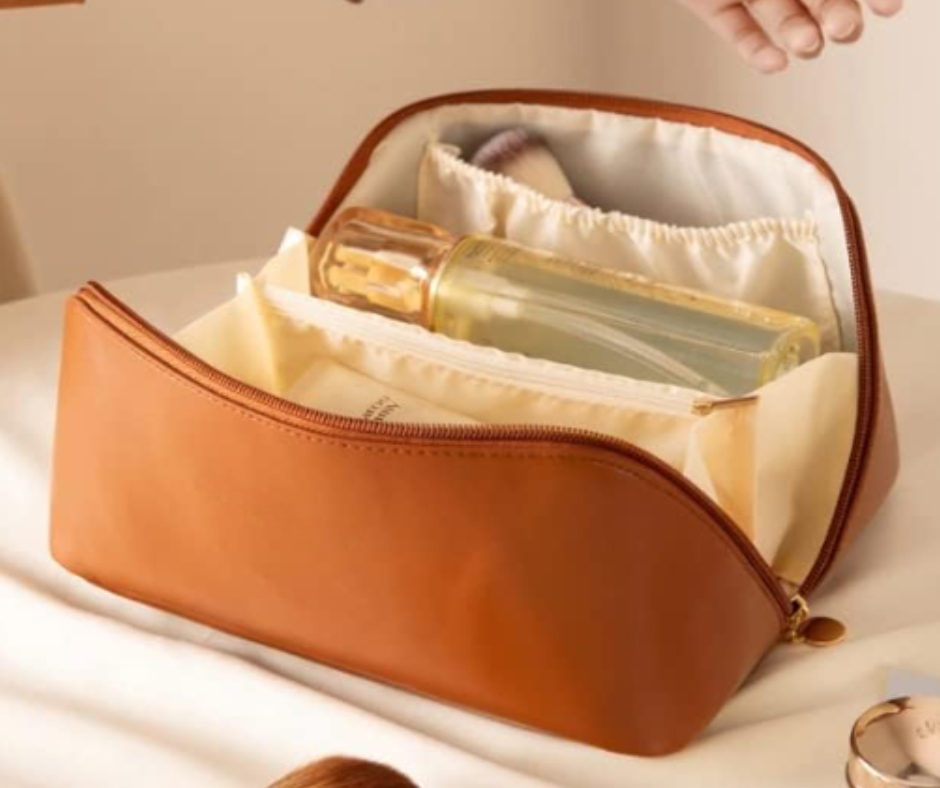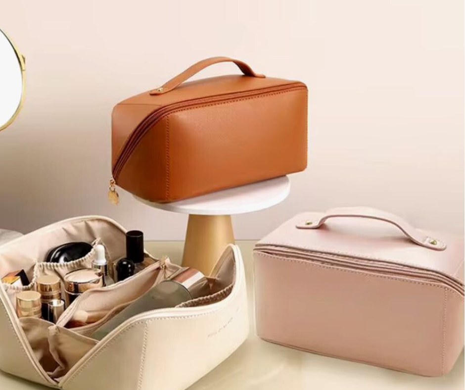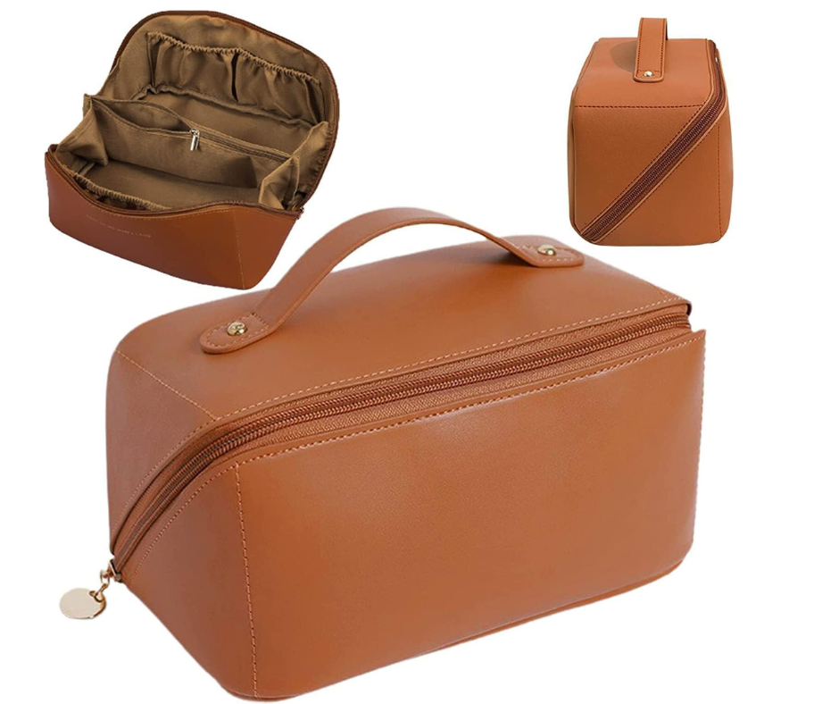 Stay organized and effortlessly chic with our fold-open makeup bag in luxe camel leather. Crafted for the modern beauty enthusiast, this trendy bag unfolds to reveal ample storage for all your essentials. Whether you're stashing makeup brushes, palettes, or skincare must-haves, each compartment keeps your go-to glam items tidy and easily accessible. Ideal for travel or as a stylish fixture in your vanity space, this makeup bag doubles as a sleek, on-the-go glam station. Perfect for keeping your beauty game strong, wherever you are!